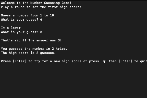 This is a simple number guessing game built in Python. The game generates a random number between 1 and 10, and the player has to guess the number in as few attempts as possible. The game keeps track of the player's high score, and the player can choose to play again to try and beat their high score.
