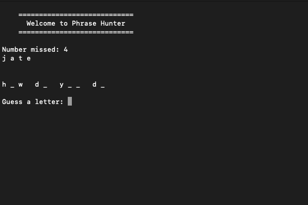 This is a command-line game built in Python where the player has to guess a phrase by guessing individual letters. The game displays a phrase as a series of underscores, and the player has to guess letters one at a time. If the player guesses a correct letter, it is displayed in the phrase. If the player guesses an incorrect letter, the letter is displayed above the phrase. The game ends when the player guesses the phrase or makes five incorrect guesses.