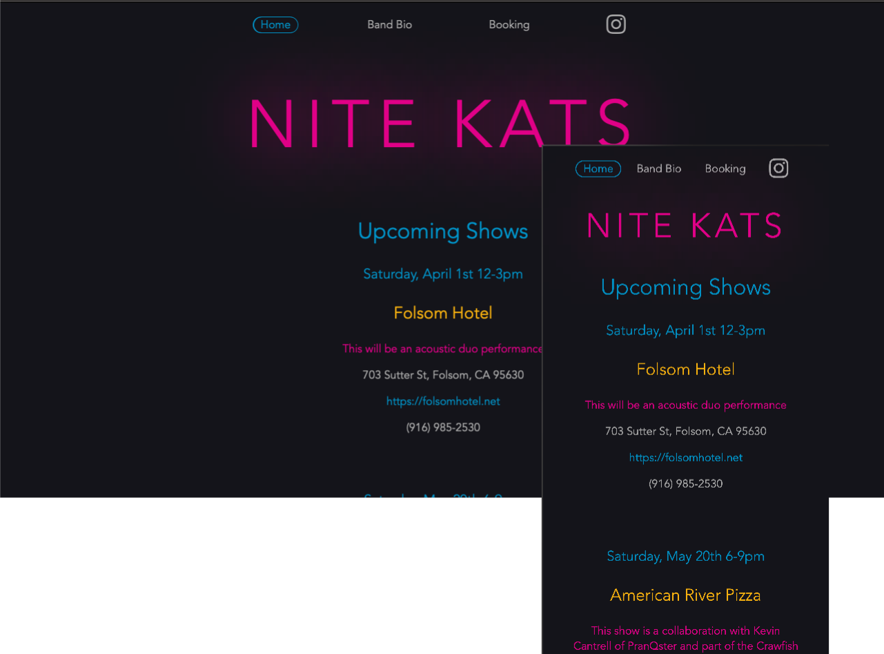 I built this website to share information about my band, Nite Kats. The home page displays our upcoming shows. Venues can be added to the database. Each event is associated with a venue and the venue details are used to create each event post.